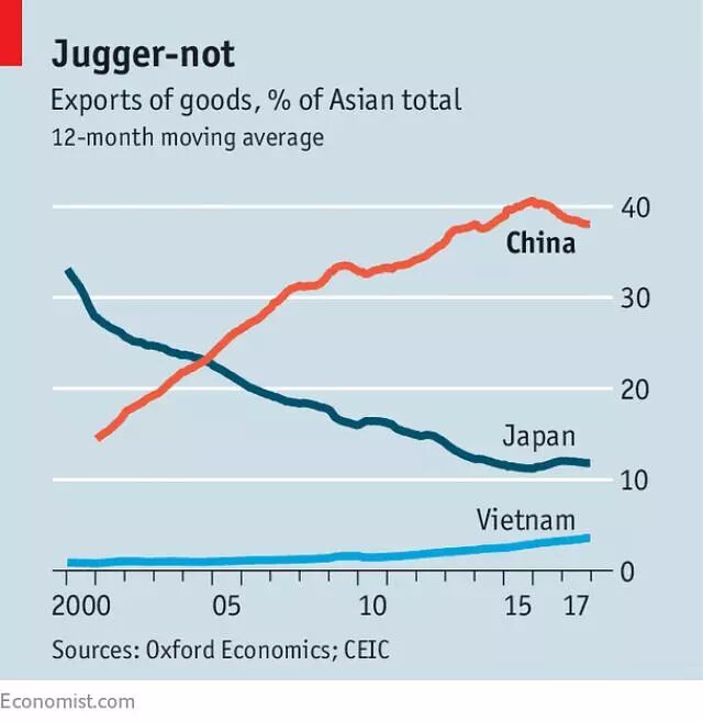 从1978年改革开放起,中国出口的比重占全球出口不断上升,尤其是2001年加入WTO之后,但2016年开始拐点发生,同时出口比重在亚洲的占比也开始下降,低价值市场上份额不断被越南蚕食,在高价值市场上,日本、韩国和中国台湾地区总计比重也在增加。此为后话了。