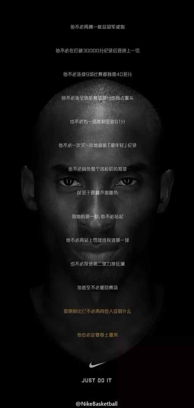 还有之前耐克NIKE为科比复出做的一个广告我很喜欢,这里NIKE就是用了大量的具体场景和事实来塑造细节,不仅是在致敬科比,更是凸显出耐克品牌的拼搏精神。