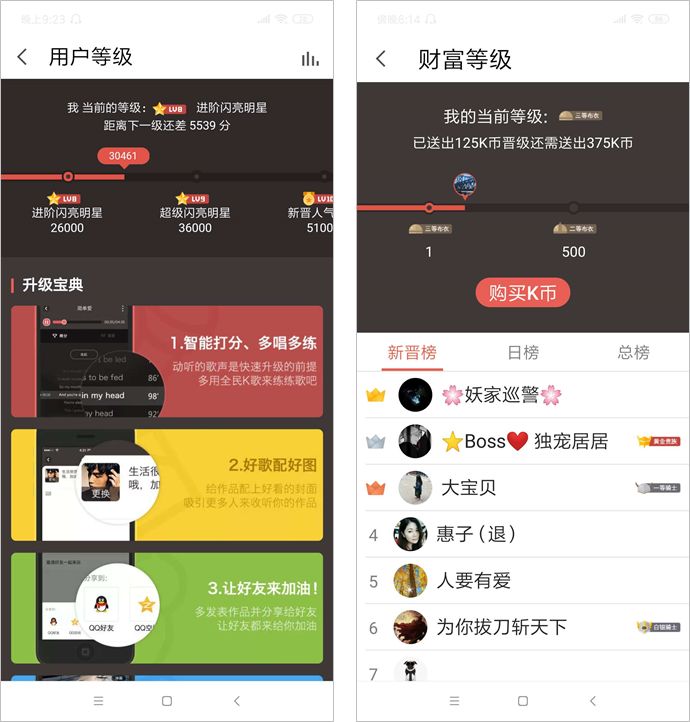 全民 K 歌除了自然等级之外,还有一个财富等级排行,提升等级的条件就是花钱买 K 币,财富等级的下方还有相应的送 K 币排行榜。就这样,平台通过榜单和等级的双重“刺激”让用户在平台产生付费行为。