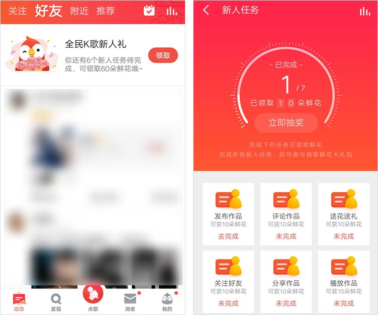 这些任务中有发布作品、评论作品、送花送礼等,从这些任务中我们可以看出全民 K 歌的良苦用心:让新手期用户在平台上产生内容并与好友进行互动。
