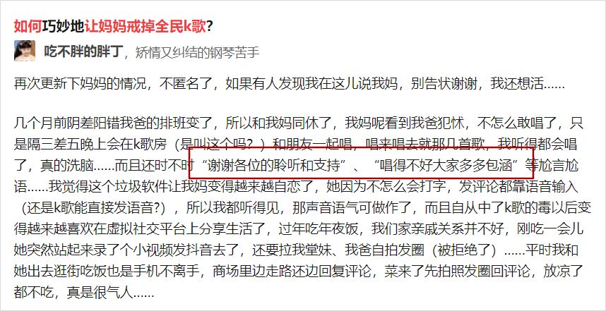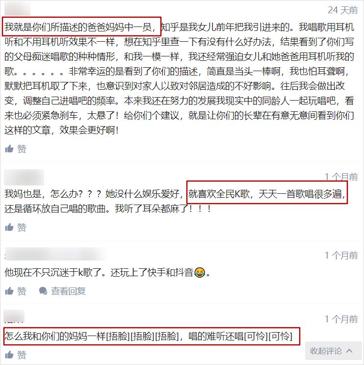 经过我几天的观察,发现我妈这是中了一个叫做全民 K 歌的“毒”。于是我就知乎了一下怎么让她戒掉,这一搜才发现,真的是同一个世界同一个妈啊。