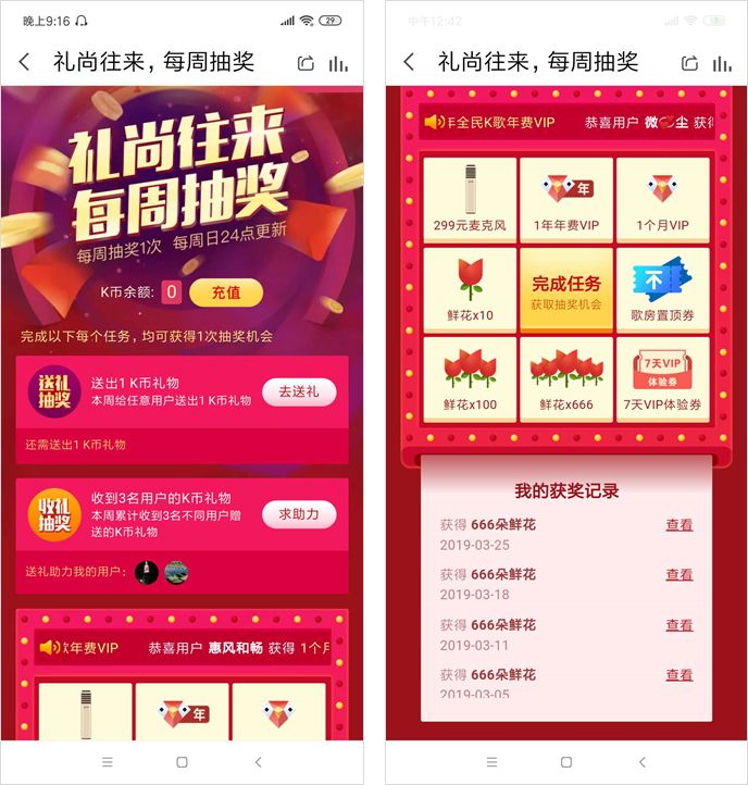 这个是全民 K 歌在 2018 年 7 月开始做的一个活动,活动规则是给别人送一次 K 币(需要付费 6元=60 K 币)或者收到 3 个人送的 K 币,可以获得抽奖机会。