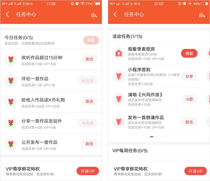 除了领花之外,他们每天都会在平台看直播,刷小视频,听歌练歌……等等,这个又是什么操作?原来,这些行为都是因为平台的成长任务。对于接触平台的普通用户来说,成长任务中包括每日任务和活动任务,这两种任务是平台为了达到不同目的设置的任务体系。